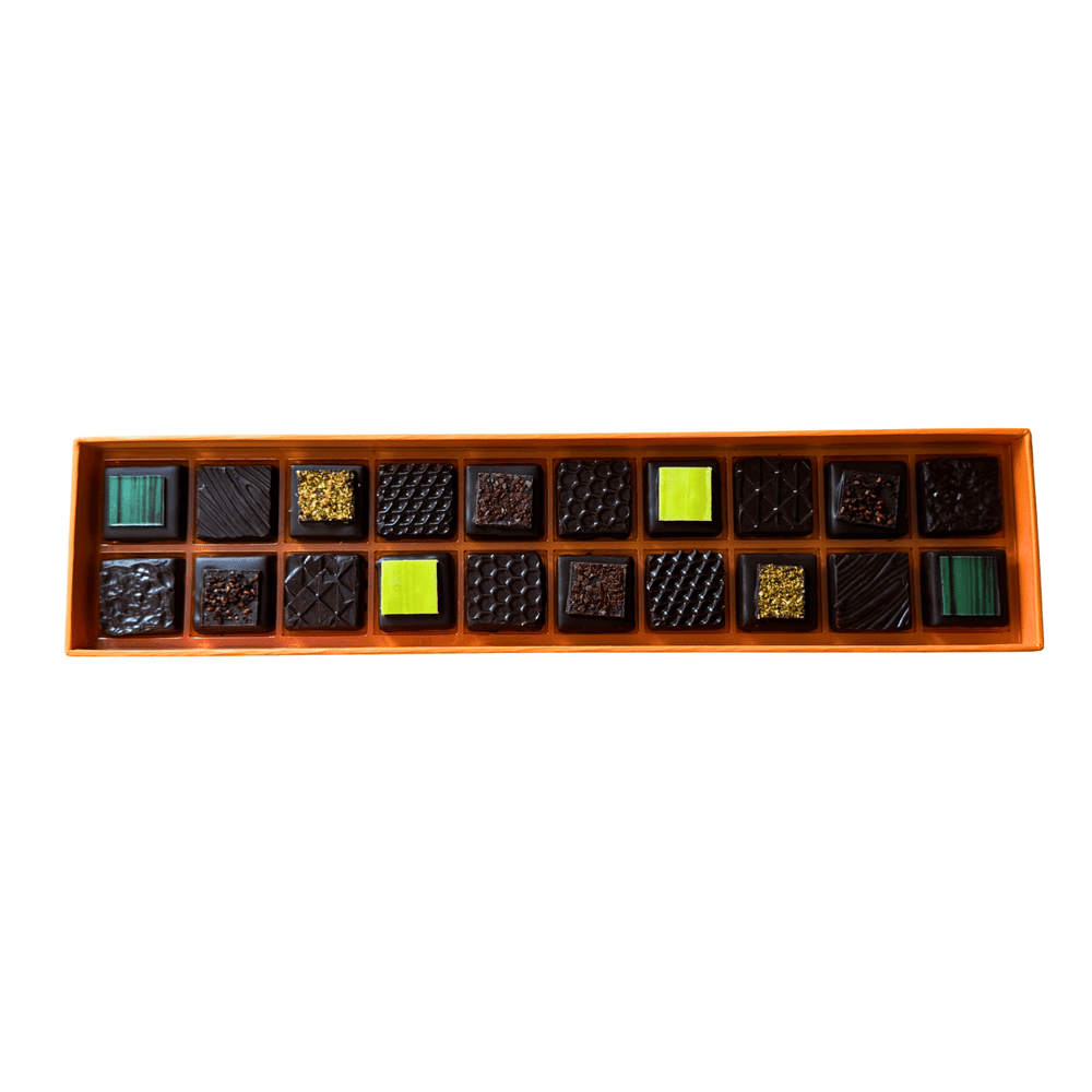 Ingrédients : Chocolat Noir 58 %(58% minimum de cacao, pâte de cacao, sucre, beurre de cacao, émulsifiant: lécithine de soja, arôme naturel de vanille), Crème, Chocolat Lait 38 %(38% minimum de cacao, Sucre, beurre de cacao, poudre de lait entier, masse de cacao, émulsifiant: lécithines de soja), Beurre, Sorbitol, Sucre Inverti, Glucose, Miel, Framboise, Beurre De Cacao, Menthe, Gingembre Frais, Café, Sucre, Thé Jasmin, Cardamome, Muscade, Alcool Mandarine, Fève De Tonka, Sel, Zeste, Safran.