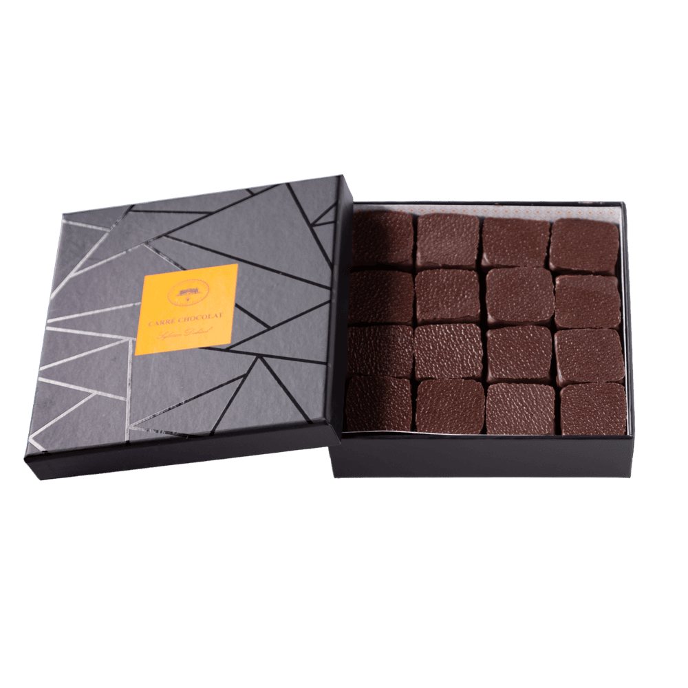 Praliné croquant amande noisette aux brisures de crêpes dentelles, enrobé de chocolat noir.