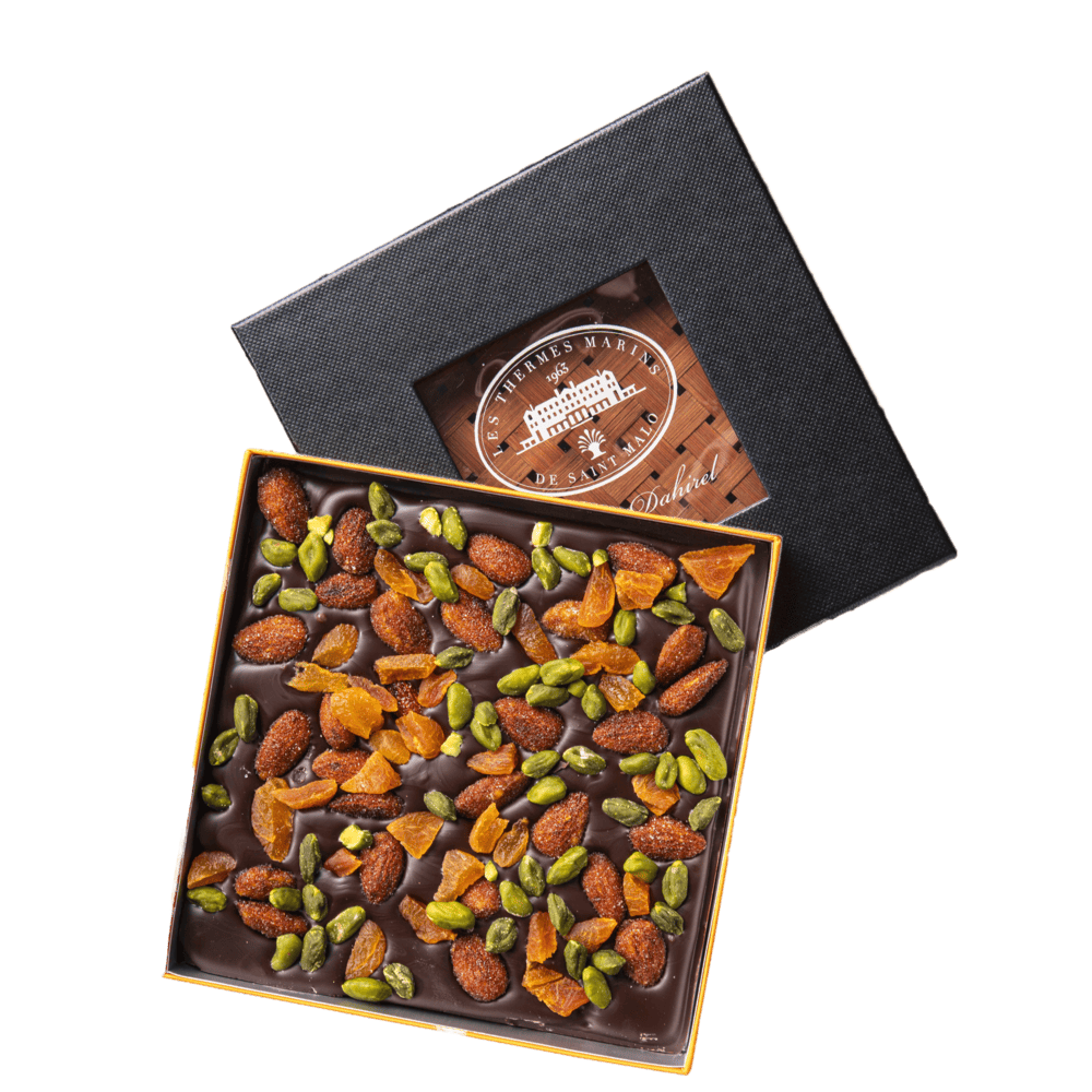 Ingrédients : Chocolat noir 70% cacao minimum, fèves de cacao, sucre, beurre de cacao, cacao masse, lécithine soja, abricot sec, pistache, amande.